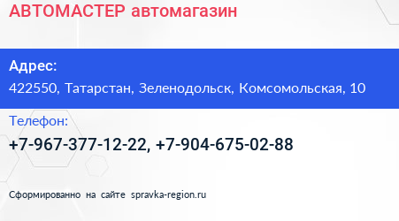 АВТОМАСТЕР, автомагазин по адресу 422550, Татарстан, Зеленодольск, Комсомольская, 10 в дальнейшем Организация, размещена в следующих категориях: