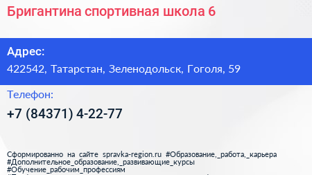 Бригантина, спортивная школа №6 по адресу 422542, Татарстан, Зеленодольск, Гоголя, 59 в дальнейшем Организация, размещена в следующих категориях: