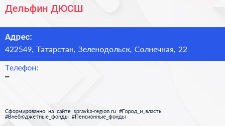 Дельфин, ДЮСШ по адресу 422549, Татарстан, Зеленодольск, Солнечная, 22 в дальнейшем Организация, размещена в следующих категориях: