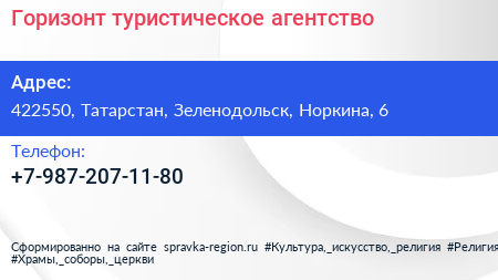Горизонт, туристическое агентство по адресу 422550, Татарстан, Зеленодольск, Норкина, 6 в дальнейшем Организация, размещена в следующих категориях: