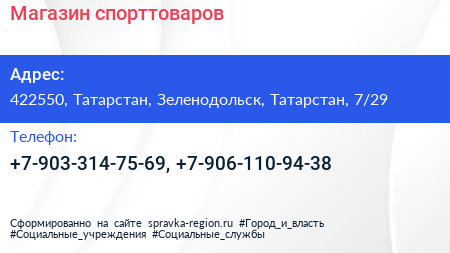 Магазин спорттоваров по адресу 422550, Татарстан, Зеленодольск, Татарстан, 7/29 в дальнейшем Организация, размещена в следующих категориях: