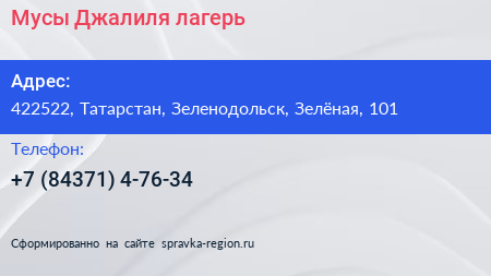Мусы Джалиля, лагерь по адресу 422522, Татарстан, Зеленодольск, Зелёная, 101 в дальнейшем Организация, размещена в следующих категориях: