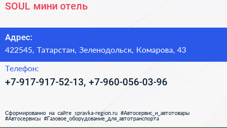 SOUL, мини-отель по адресу 422545, Татарстан, Зеленодольск, Комарова, 43 в дальнейшем Организация, размещена в следующих категориях: