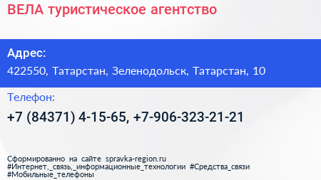 ВЕЛА, туристическое агентство по адресу 422550, Татарстан, Зеленодольск, Татарстан, 10 в дальнейшем Организация, размещена в следующих категориях: