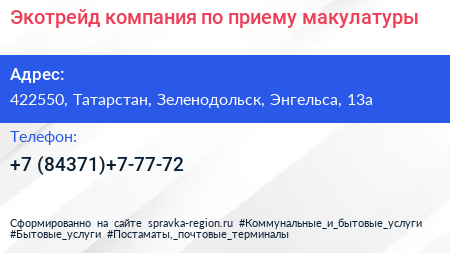 Экотрейд, компания по приему макулатуры по адресу 422550, Татарстан, Зеленодольск, Энгельса, 13а в дальнейшем Организация, размещена в следующих категориях: