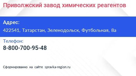 Приволжский завод химических реагентов по адресу 422541, Татарстан, Зеленодольск, Футбольная, 8а в дальнейшем Организация, размещена в следующих категориях: