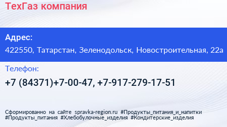 ТехГаз, компания по адресу 422550, Татарстан, Зеленодольск, Новостроительная, 22а в дальнейшем Организация, размещена в следующих категориях: