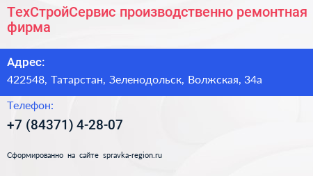 ТехСтройСервис, производственно-ремонтная фирма по адресу 422548, Татарстан, Зеленодольск, Волжская, 34а в дальнейшем Организация, размещена в следующих категориях: