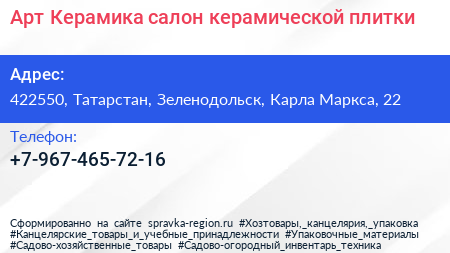 Арт Керамика, салон керамической плитки по адресу 422550, Татарстан, Зеленодольск, Карла Маркса, 22 в дальнейшем Организация, размещена в следующих категориях: