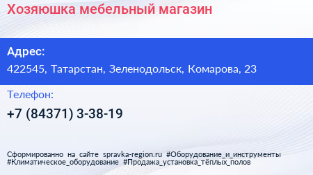 Хозяюшка, мебельный магазин по адресу 422545, Татарстан, Зеленодольск, Комарова, 23 в дальнейшем Организация, размещена в следующих категориях: