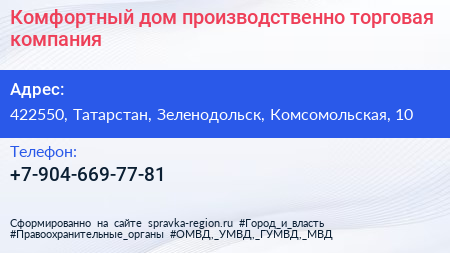 Комфортный дом, производственно-торговая компания по адресу 422550, Татарстан, Зеленодольск, Комсомольская, 10 в дальнейшем Организация, размещена в следующих категориях: