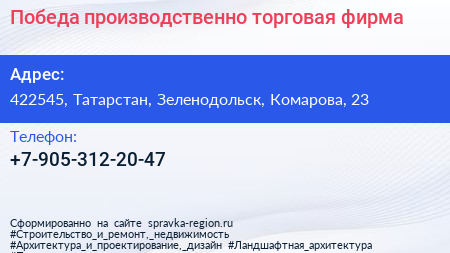 Победа, производственно-торговая фирма по адресу 422545, Татарстан, Зеленодольск, Комарова, 23 в дальнейшем Организация, размещена в следующих категориях: