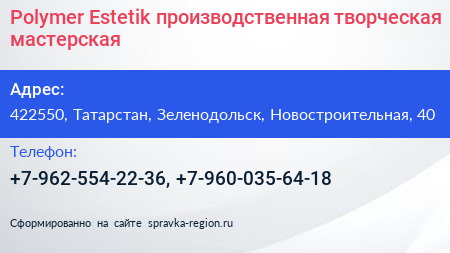 Polymer Estetik, производственная творческая мастерская по адресу 422550, Татарстан, Зеленодольск, Новостроительная, 40 в дальнейшем Организация, размещена в следующих категориях: