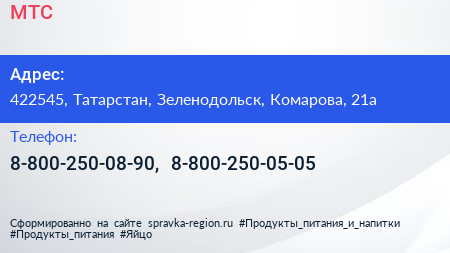 МТС по адресу 422545, Татарстан, Зеленодольск, Комарова, 21а в дальнейшем Организация, размещена в следующих категориях: