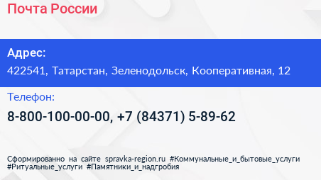 Почта России по адресу 422541, Татарстан, Зеленодольск, Кооперативная, 12 в дальнейшем Организация, размещена в следующих категориях: