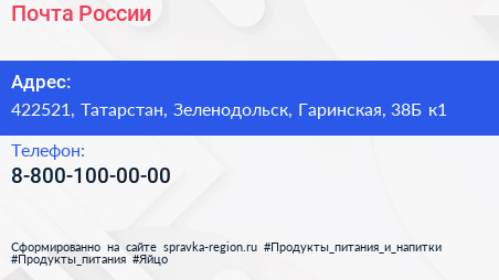 Почта России по адресу 422521, Татарстан, Зеленодольск, Гаринская, 38Б к1 в дальнейшем Организация, размещена в следующих категориях: