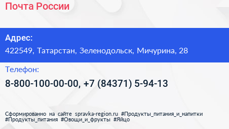 Почта России по адресу 422549, Татарстан, Зеленодольск, Мичурина, 28 в дальнейшем Организация, размещена в следующих категориях: