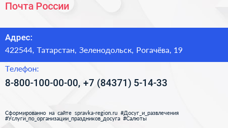 Почта России по адресу 422544, Татарстан, Зеленодольск, Рогачёва, 19 в дальнейшем Организация, размещена в следующих категориях: