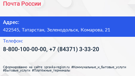 Почта России по адресу 422545, Татарстан, Зеленодольск, Комарова, 21 в дальнейшем Организация, размещена в следующих категориях: