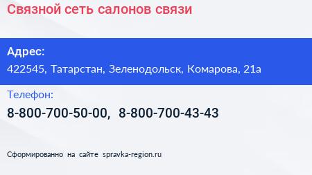 Связной, сеть салонов связи по адресу 422545, Татарстан, Зеленодольск, Комарова, 21а в дальнейшем Организация, размещена в следующих категориях: