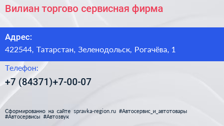 Вилиан, торгово-сервисная фирма по адресу 422544, Татарстан, Зеленодольск, Рогачёва, 1 в дальнейшем Организация, размещена в следующих категориях: