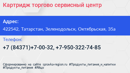 Картридж, торгово-сервисный центр по адресу 422542, Татарстан, Зеленодольск, Октябрьская, 35а в дальнейшем Организация, размещена в следующих категориях: