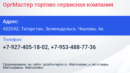 ОргМастер, торгово-сервисная компания по адресу 422542, Татарстан, Зеленодольск, Чкалова, 4а в дальнейшем Организация, размещена в следующих категориях: