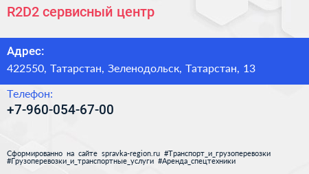 R2D2, сервисный центр по адресу 422550, Татарстан, Зеленодольск, Татарстан, 13 в дальнейшем Организация, размещена в следующих категориях: