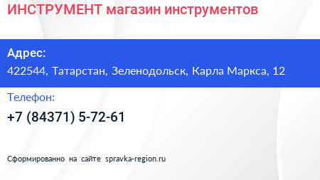 ИНСТРУМЕНТ, магазин инструментов по адресу 422544, Татарстан, Зеленодольск, Карла Маркса, 12 в дальнейшем Организация, размещена в следующих категориях: