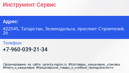 Инструмент-Сервис по адресу 422545, Татарстан, Зеленодольск, проспект Строителей, 26 в дальнейшем Организация, размещена в следующих категориях: