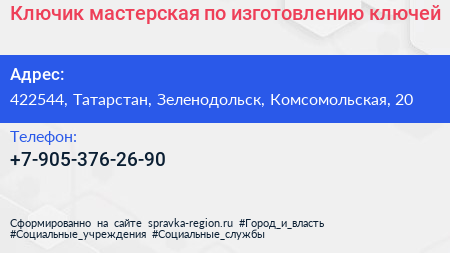 Ключик, мастерская по изготовлению ключей по адресу 422544, Татарстан, Зеленодольск, Комсомольская, 20 в дальнейшем Организация, размещена в следующих категориях: