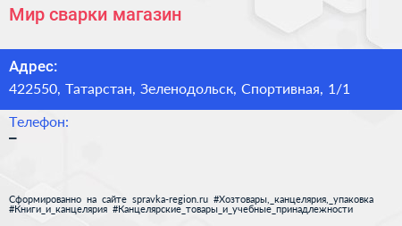 Мир сварки, магазин по адресу 422550, Татарстан, Зеленодольск, Спортивная, 1/1 в дальнейшем Организация, размещена в следующих категориях:
