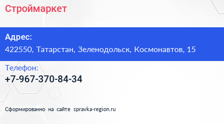 Строймаркет по адресу 422550, Татарстан, Зеленодольск, Космонавтов, 15 в дальнейшем Организация, размещена в следующих категориях: