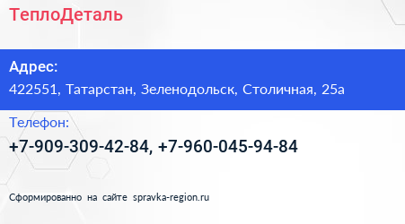 ТеплоДеталь по адресу 422551, Татарстан, Зеленодольск, Столичная, 25а в дальнейшем Организация, размещена в следующих категориях: