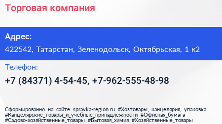 Торговая компания по адресу 422542, Татарстан, Зеленодольск, Октябрьская, 1 к2 в дальнейшем Организация, размещена в следующих категориях: