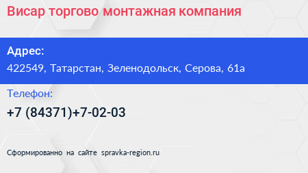 Висар, торгово-монтажная компания по адресу 422549, Татарстан, Зеленодольск, Серова, 61а в дальнейшем Организация, размещена в следующих категориях: