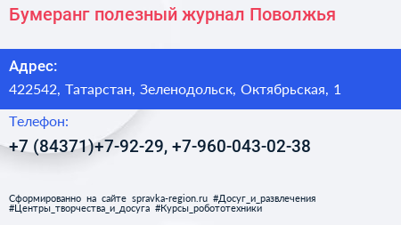 Бумеранг, полезный журнал Поволжья по адресу 422542, Татарстан, Зеленодольск, Октябрьская, 1 в дальнейшем Организация, размещена в следующих категориях: