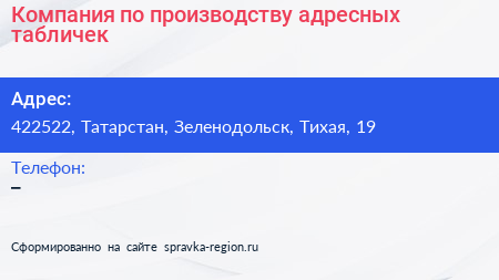 Компания по производству адресных табличек по адресу 422522, Татарстан, Зеленодольск, Тихая, 19 в дальнейшем Организация, размещена в следующих категориях: