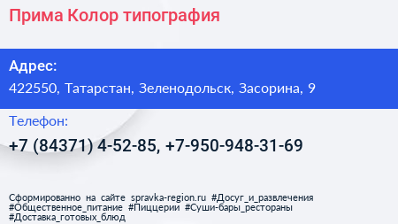Прима-Колор, типография по адресу 422550, Татарстан, Зеленодольск, Засорина, 9 в дальнейшем Организация, размещена в следующих категориях: