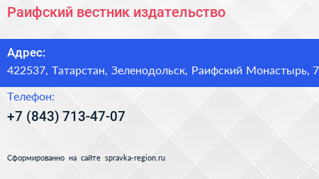 Раифский вестник, издательство по адресу 422537, Татарстан, Зеленодольск, Раифский Монастырь, 7 в дальнейшем Организация, размещена в следующих категориях: