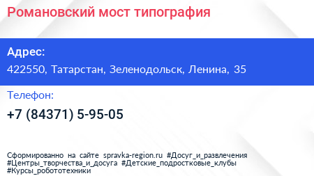 Романовский мост, типография по адресу 422550, Татарстан, Зеленодольск, Ленина, 35 в дальнейшем Организация, размещена в следующих категориях: