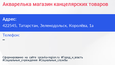 Акварелька, магазин канцелярских товаров по адресу 422545, Татарстан, Зеленодольск, Королёва, 1а в дальнейшем Организация, размещена в следующих категориях: