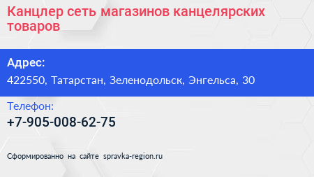 Канцлер, сеть магазинов канцелярских товаров по адресу 422550, Татарстан, Зеленодольск, Энгельса, 30 в дальнейшем Организация, размещена в следующих категориях: