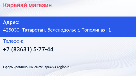 Каравай, магазин по адресу 425030, Татарстан, Зеленодольск, Тополиная, 1 в дальнейшем Организация, размещена в следующих категориях: