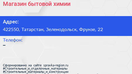 Магазин бытовой химии по адресу 422550, Татарстан, Зеленодольск, Фрунзе, 22 в дальнейшем Организация, размещена в следующих категориях: