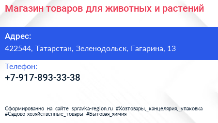 Магазин товаров для животных и растений по адресу 422544, Татарстан, Зеленодольск, Гагарина, 13 в дальнейшем Организация, размещена в следующих категориях: