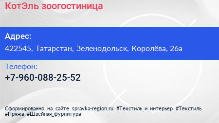 КотЭль, зоогостиница по адресу 422545, Татарстан, Зеленодольск, Королёва, 26а в дальнейшем Организация, размещена в следующих категориях: