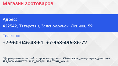 Магазин зоотоваров по адресу 422542, Татарстан, Зеленодольск, Ленина, 59 в дальнейшем Организация, размещена в следующих категориях: