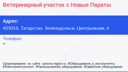 Ветеринарный участок, с. Новые Параты по адресу 425016, Татарстан, Зеленодольск, Центральная, 4 в дальнейшем Организация, размещена в следующих категориях: