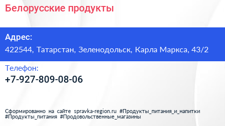 Белорусские продукты по адресу 422544, Татарстан, Зеленодольск, Карла Маркса, 43/2 в дальнейшем Организация, размещена в следующих категориях: